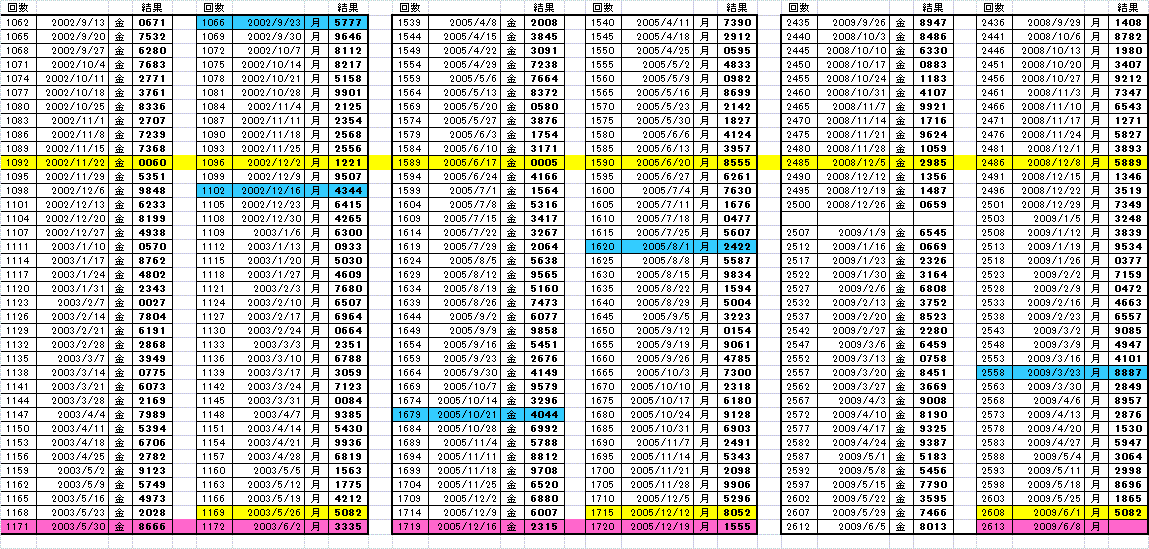 明 N4の予想 2009年06月08日 曜日は語る? 6月8日 六白 (先週の 0258 から共通点を探すならば) よって、トリプル出目に期待。 あくまで、期待・・・・。 出るまで待つ? トリプルショーを見てみたい。 先日(2週間前くらい?)の <インスピ予想>でのアメデオ・モディリアーニ から 「0138」 出現したこと、 そして、世間的な不安定さ(=人生の明暗) から、数字にも驚くような出目を期待してみたい。 あなたなら、どのトリプル出目? PR